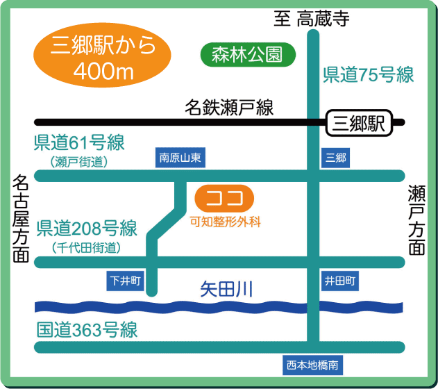 電車でお越しの方:名鉄瀬戸線三郷駅で下車、西へ徒歩5分